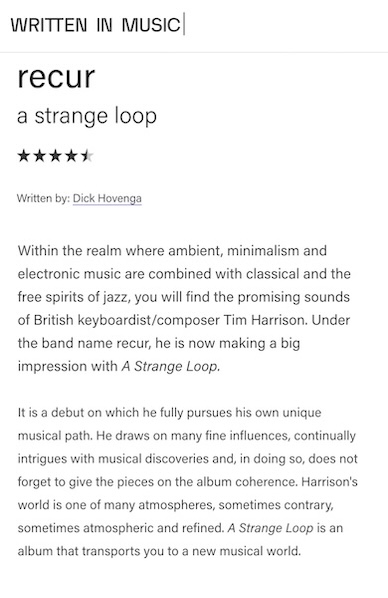 Combining ambient and electronic music with classical and jazz, A Strange Loop is the cinematic debut LP from Tim Harrison's project recur.